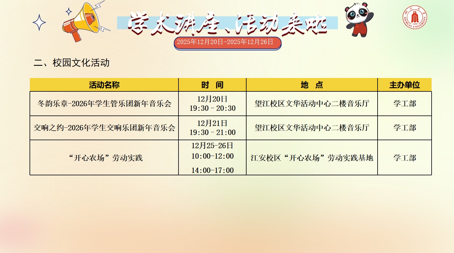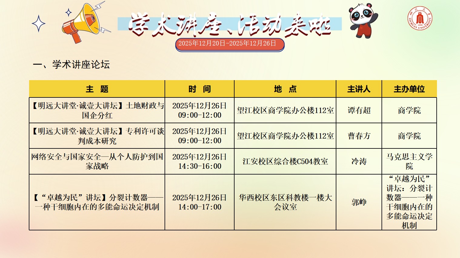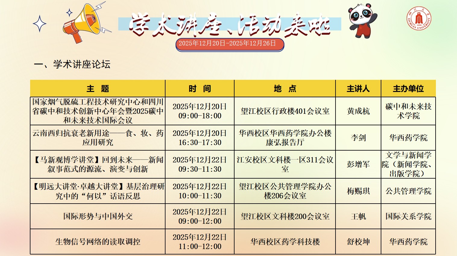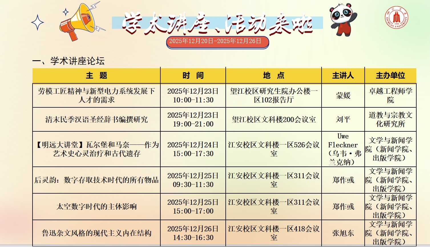 成人影视片 2025年12月20日-12月26日学术讲座和校园文化活动预告